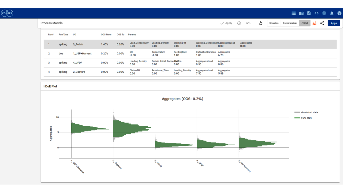 为了在这篇博文中展示端到端数字孪生的好处,我们将使用一个简化后的工业单克隆抗体(mAb)生产工艺的演示数据集。该数据集包括跨越5个不同单元操作(UOs)的5个大规模生产活动,以及基于实验设计方法(DoE)每1个单元操作进行15次实验,这是生物制药行业工艺验证第1阶段的常见数据集大小。我们将对两种响应进行建模:聚集体(关键质量属性,CQA)和产品量(关键绩效指标,KPI)。
