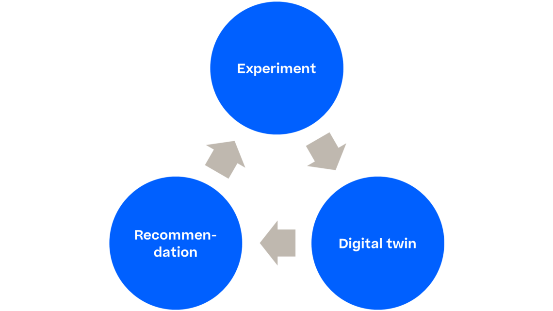 我们最近建立了一个推荐系统¹,是基于成熟的数字孪生技术²所建立的,它能告诉我们应该在哪个操作单元进行哪个实验。此外,随着新数据的生成,整个生产过程的端到端数字孪生系统也会随之更新,如有需要,建议进行额外的实验(图 1)。该程序具有自我学习的功能,一旦对工艺流程有了足够的了解,就会停止,实现工艺流程归档。