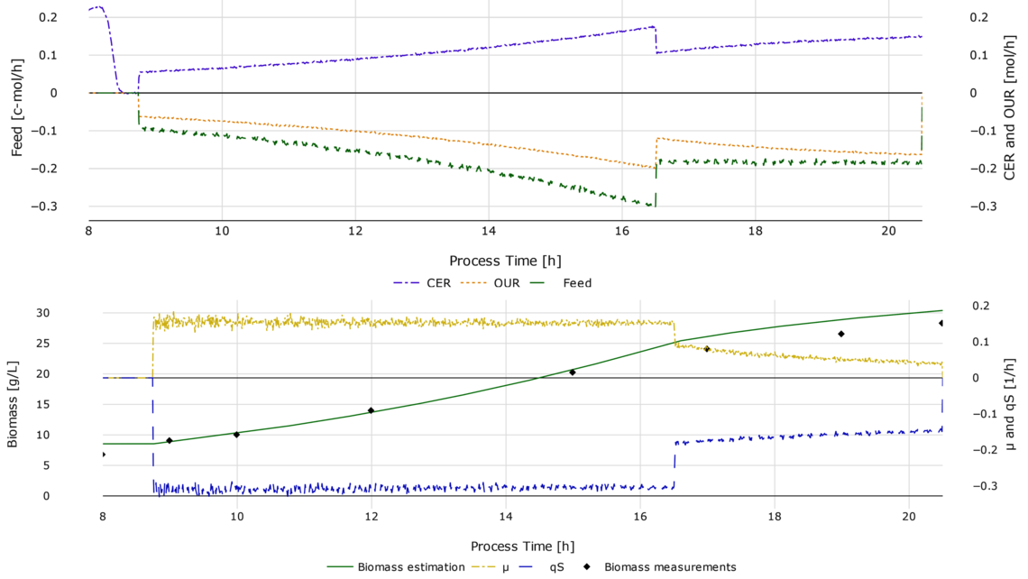 一旦校准完成,生物质软传感器可以在几秒钟内完成部署。用户可以通过一个简单直观的配置过程轻松调整关键参数,可灵活地将计算应用于各种发酵过程中。除了测量生物质浓度外,软传感器还提供实时性能指标,如特定生长速率(µ)、底物摄取率(qS)、摄氧率(OUR)和碳释放率(CER)。接着,这些结果可以直接可视化,用于洞察生物工艺流程状态,实现实时的过程控制和生产后分析(见图2和图3)。