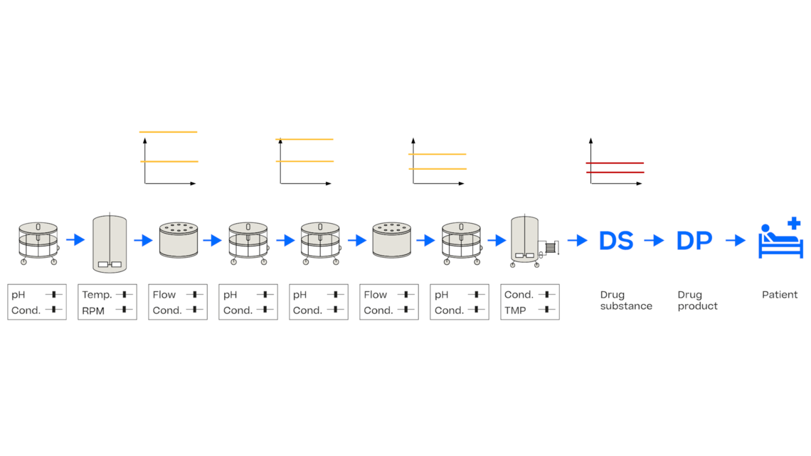 在典型的工艺开发或工艺表征中,对单个单元操作进行实验,以确定质量合格产品的工艺参数。可以使用诸如统计实验设计(DoE)之类的高效技术来以最少的实验次数达到最大的信息增益。基于工艺输入(如工艺参数和关键材料属性)与输出(通常为关键质量属性(CQA))之间的已确定关系,可以定义输入的控制策略。
