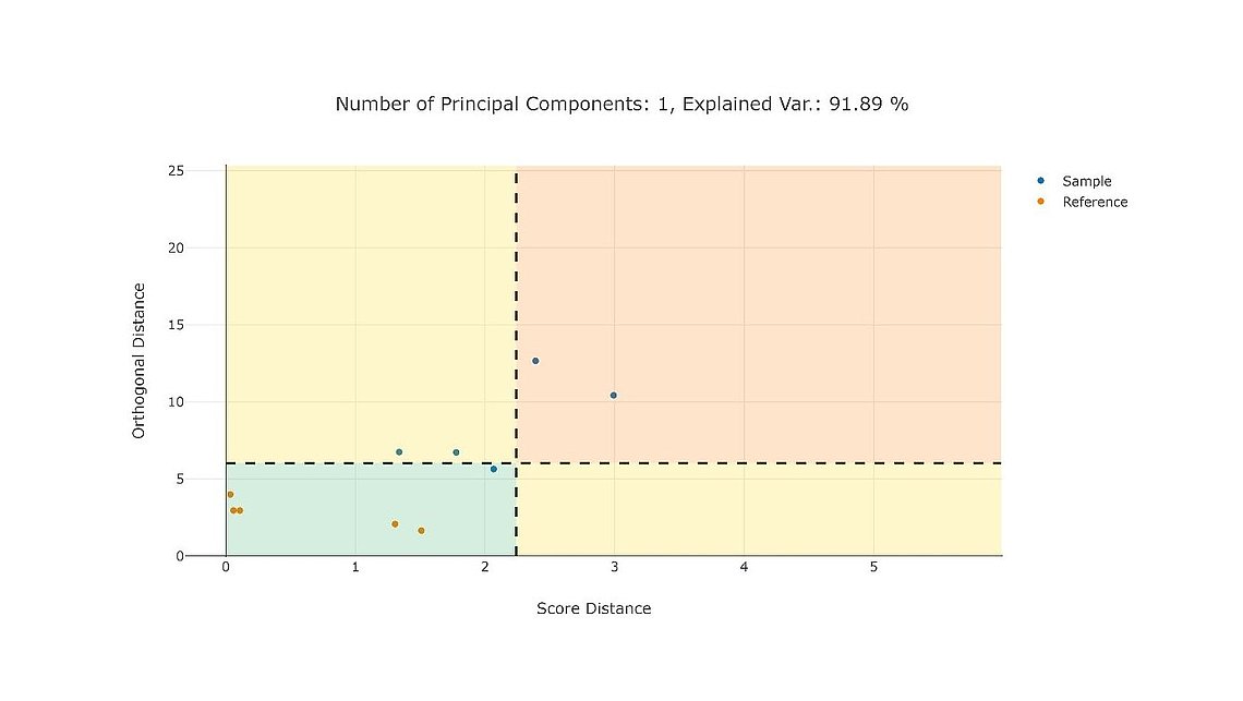 这种降维方法可以使多维数据在简单的图表中可视化。生产活动可以基于多个标量特征(例如:工艺参数和质量属性)进行比较。多个二维图能够被创建,它们的区别在于选择的Y轴和X轴。如果选择主成分作为轴(双标图),该图可以显示一组生产活动中的集群。另一个选项是选择得分距离和单个活动到模型的正交距离作为轴。这样可以在多变量空间中识别外围活动。