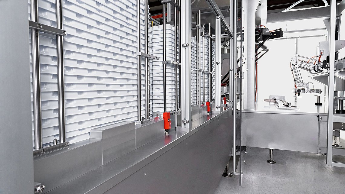 从多样化的集成选项中选择,以适应不同产线的配置。我们托盘的装料卸料解决方案是为小型回旋式托盘、中型传送托盘和大型灭菌式托盘而设计。您的产品被轻柔卫生地处理,但同时产线是高效而灵活的。高性能的托盘装卸技术确保您的产品流动顺畅,即使您选择更快的速度配置,仍能减少对缓冲的需求。