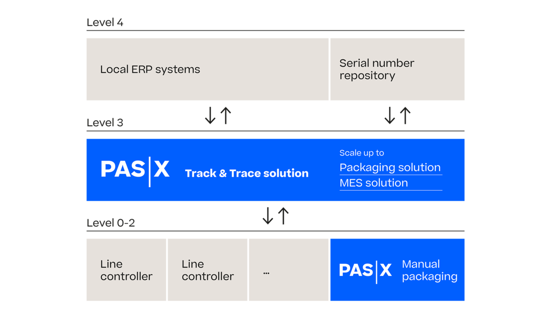 维隆PAS-X追踪追溯模块既可以作为独立解决方案部署,也可以无缝集成到维隆PAS-X包装解决方案(包括EBR)或MES中。如果您使用的是综合的包装解决方案,您还将受益于对生产过程的全面控制和记录,包括设备管理,该解决方案可以随时轻松扩展为全面的维隆PAS-X MES。